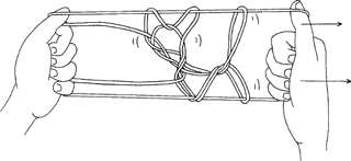 「耳の大きな犬」は大変人気のあるあやとりで、あやとりを始めた人の多くが最初の目標にするあやとりです。皆さんは、このあやとりを次の図のように取っているでしょう。犬は右から左に走ります。